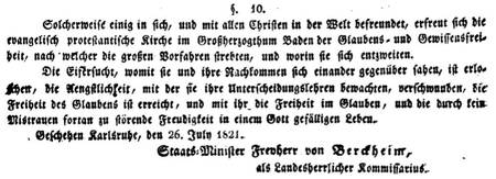 Urkunde über die Vereinigung beider Evangelischen Kirchen in dem Großherzogtum Baden Vom 26. Juli 1821(Reg.Bl. 1821, Beil. zu Nr. XVI) "Gleich hochherzig und gleich begeistert für die Wahrheit, wie sie der Welt im Evangelium offenbar geworden, trennten sich nichts destoweniger unsre frommen Vorfahren in einer Hauptlehre derselben. So entstanden die evangelisch-lutherische und die evangelisch-reformierte Kirche. Jede von beiden hielt an ihrer Lehre fest, verteidigte sie und bestritt die ihr gegenüber befindliche; in jeder gewann allmählich der Ritus, die Verfassung und die innere Einrichtung der Kirche eine eigentümliche Gestaltung. So erhielt sich die Trennung durch drei Jahrhunderte hindurch."